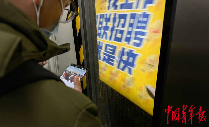 3月5日上午9时许,北京地铁6号线,一位乘客正在用手机观看十四届全国人大二次会议开幕会直播。陈鹏多/摄