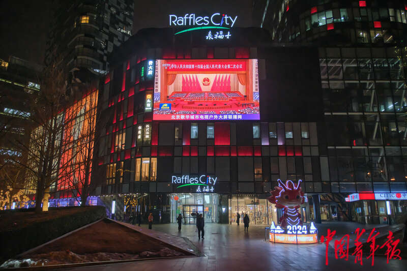 3月5日晚,北京市东城区,一处户外屏幕正在播放新闻联播里关于十四届全国人大二次会议开幕的新闻画面。田嘉硕/摄