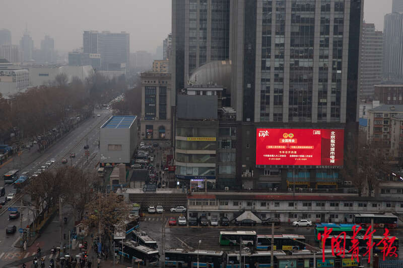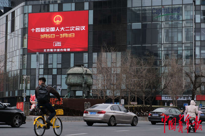 3月4日,北京市东城区,一处户外屏幕正在展示十四届全国人大二次会议的海报。田嘉硕/摄