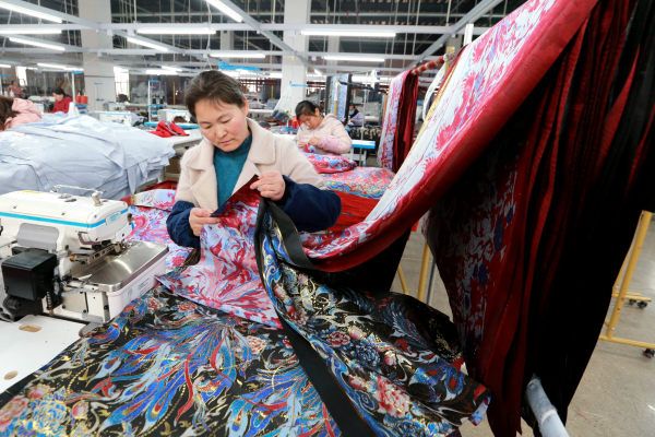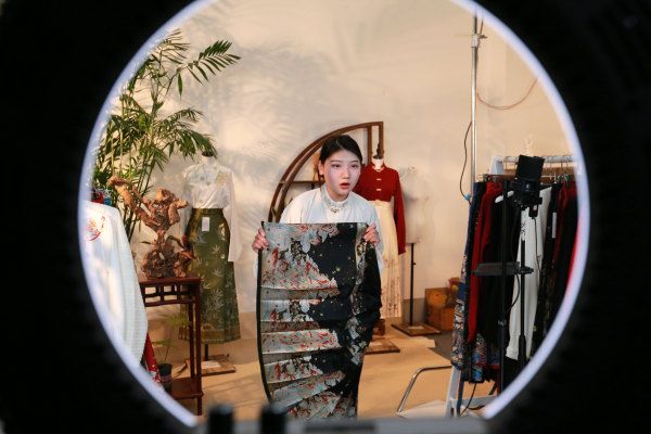 2024年3月4日,山东菏泽曹县一汉服基地内,设计师将菏泽牡丹纹饰融入马面裙。近期,山东曹县生产的马面裙销售火爆。春节假期后,曹县的汉服企业在忙着赶制订单。据曹县电子商务服务中心统计,2024年1月份,曹县汉服销售额达9.2亿元(人民币,下同),马面裙的销售额就占4亿元左右。 中新社记者 梁犇 摄