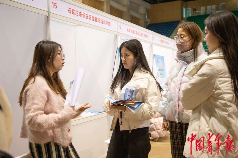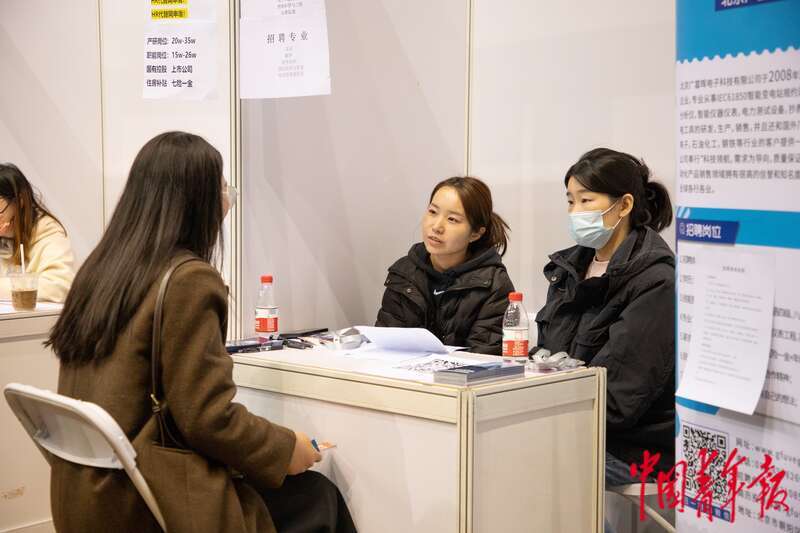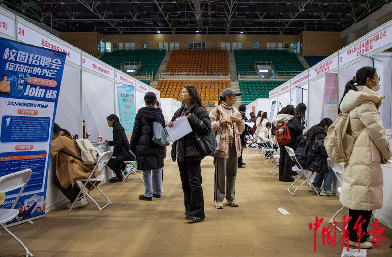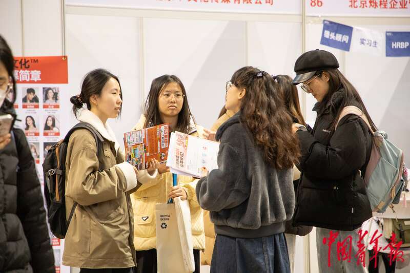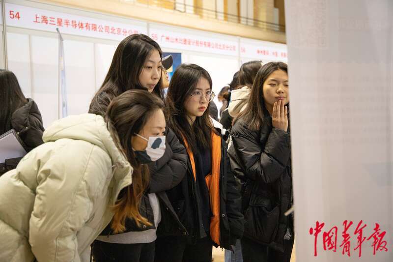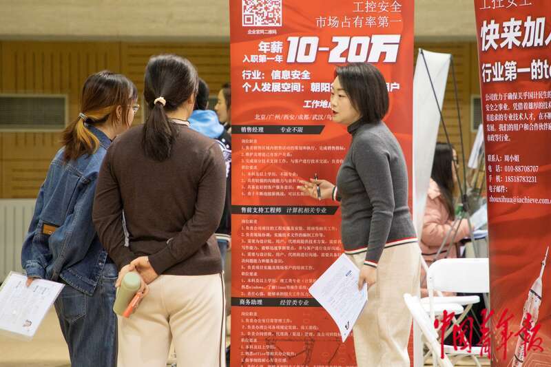 3月6日,北京,中国人民大学,一家民营科技公司的工作人员正在向同学们介绍招聘需求。近期,全国多所院校呼吁毕业生积极就业,不要只盯着升学考公考编,可投身到中小微企业、基层就业。杨郁然/摄