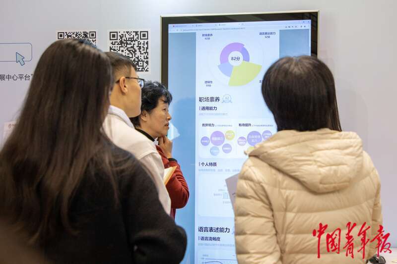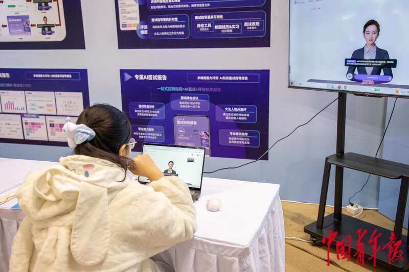 3月6日,北京,中国人民大学,求职的同学正在进行“AI面试模拟体验”。杨郁然/摄