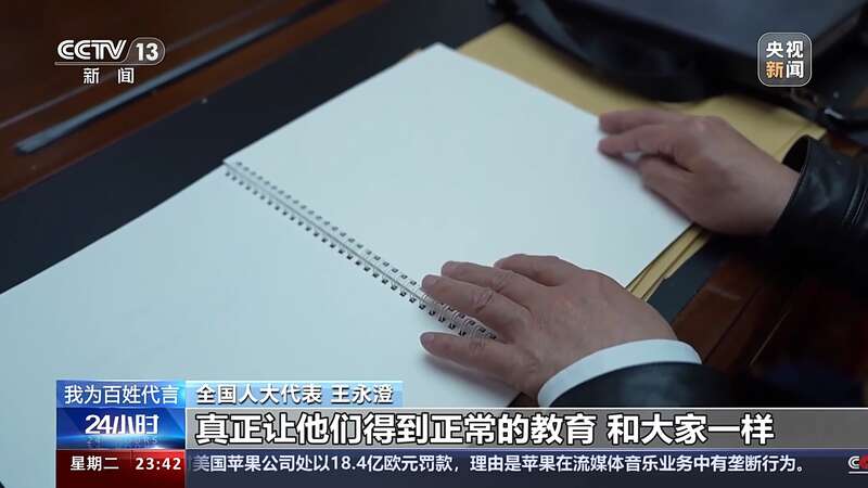 大屏幕上的 这四份文件,是由全国人大常委会 代表工作委员会 首次制作的盲文版 人大代表建议答复,在2023年11月份,交到了王永澄的手上,在他看来,这充分体现了党和国家对人民的建议的重视。而在今天的大会上,王永澄用指尖阅读了政府工作报告,这也是大会为他制作的盲文版会议材料。从去年两会到今年两会,他所有忙的重心都是残疾人所需所盼,比如,低视力学生专用的大字教材。