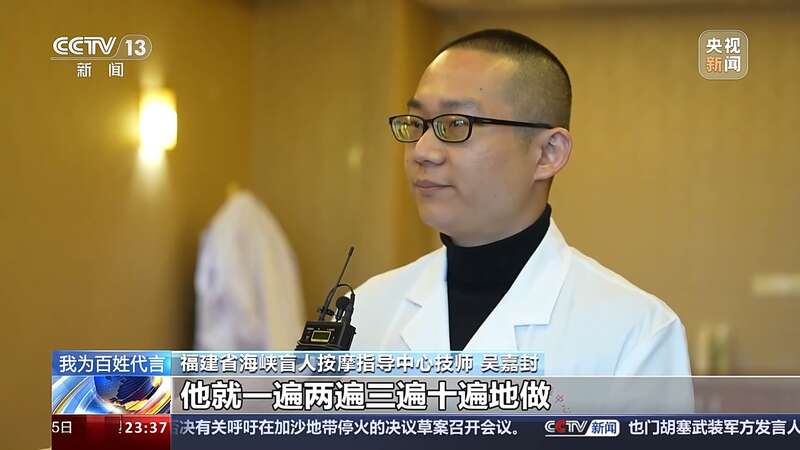 福建省海峡盲人按摩指导中心技师 吴嘉封:我们盲人理解能力会比较差一些,他就一遍两遍三遍十遍地做,一天两天三天地练手法,同样的一个手法要练好几天甚至个把星期。他说,嘉封,你来这边学推拿,很多同学全盲的,你的视力会比较方便一些,同学们之间要互相帮助,以后你学完推拿要服务社会,为以后盲人按摩事业、残疾人事业尽你自己的一份力,这句话我一辈子都不会忘记。