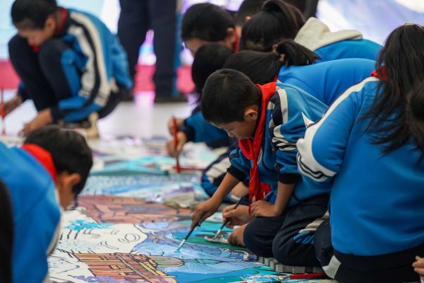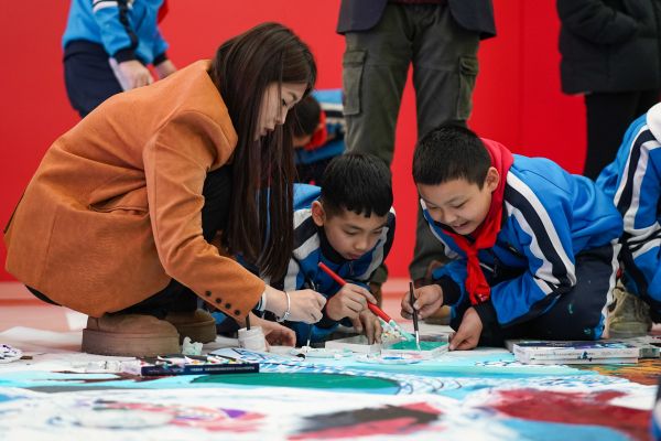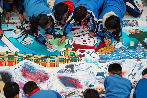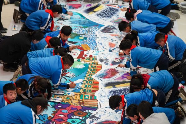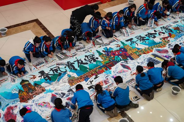 2024年3月5日迎来“惊蛰”节气,来自哈尔滨市台屯小学校的60名学生来到哈尔滨博物馆,共同绘制《春风赞友深 再聚哈尔滨》的画卷。画卷长9.4米,画面背景以象征着春日的绿色为主,上部为哈尔滨的标志性建筑,底部为晶莹剔透的冰块。 中新社发 赵宇航 摄