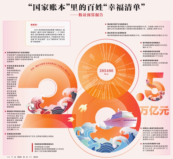 2024年积极的财政政策要“适度加力、提质增效”。翻开今年的“国家账本”,一个个数字背后,是对国家重大战略任务的财力保障,也是对民生福祉的持续发力。不断提升的“民生含量”和“民生温度”,正让“国家账本”变为百姓“幸福清单”。