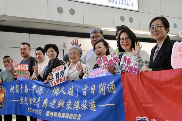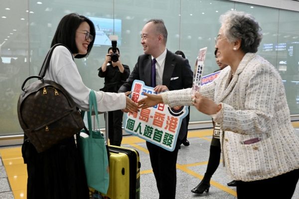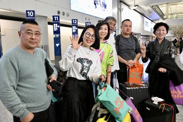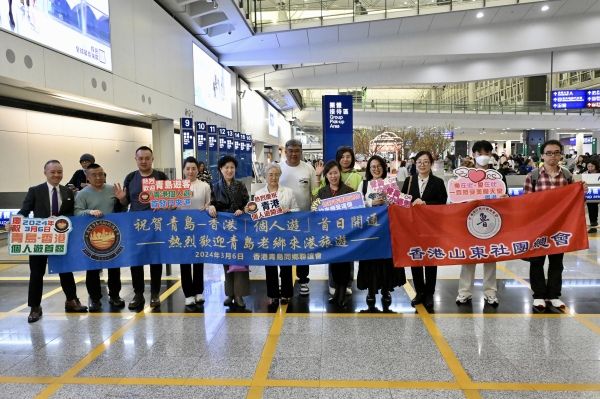 2024年3月6日,西安、青岛开放港澳“个人游”首日,首批来自青岛的“个人游”旅客抵达香港国际机场,有团体于机场迎接青岛旅客。图为来自青岛的“个人游”旅客抵达香港。 中新社记者 李志华 摄