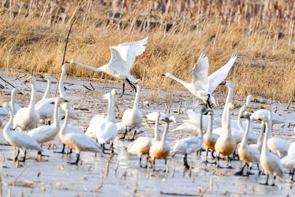 2024年3月7日,内蒙古鄂尔多斯,成群结队的野鸭、天鹅、灰鹤等等鸟类云集在达拉特旗境内的黄河湿地栖息。它们或迎空翱翔,或漫步觅食,成为一道靓丽的风景线。近年来,内蒙古不断加大生态保护力度,随着黄河湿地的生态环境不断改善,良好的环境吸引了众多迁徙候鸟来此栖息、繁殖。