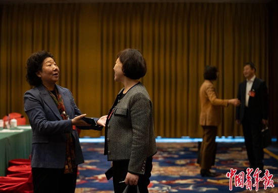 3月6日下午,北京丰大国际酒店,全国政协十四届二次会议民建界小组会议结束后,全国政协常委、北京市副市长司马红(左二)与全国政协常委、广东省政协副主席李心交谈。3月7日,司马红在全国政协十四届二次会议第二次全体会议的发言中建议,应利用好新型举国体制优势,加强国家层面统筹引导,着力提升产业体系现代化水平,以战略性新兴产业带动经济高质量发展。中青报·中青网记者 李峥苨/摄