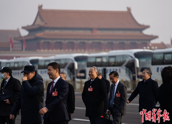 3月7日上午,北京天安门广场,全国政协十四届二次会议第二次全体会议开始前,参会委员走向人民大会堂。中青报·中青网记者 李峥苨/摄