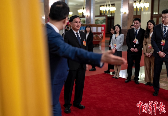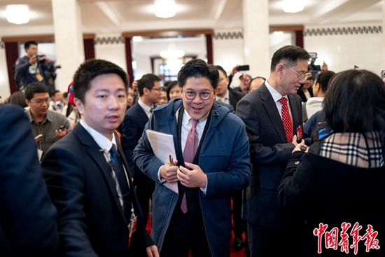3月5日,北京人民大会堂,十四届全国人大二次会议第一次全体会议结束后,全国人大代表、香港特别行政区立法会议员霍启刚被记者围住。霍启刚在今年两会拟提交建议,增加年轻人年假天数,强制实施带薪年假政策。相关话题冲上网络热搜,引发关注。中青报·中青网记者 李隽辉/摄
