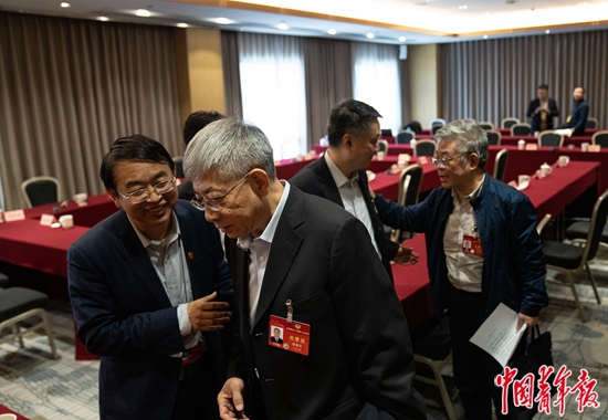 3月6日上午,北京友谊宾馆,全国政协十四届二次会议环境资源界小组会议结束后,全国政协人口资源环境委员会副主任欧青平、国务院发展研究中心研究员谷树忠、水利部黄河水利委员会原主任岳中明等委员在交流。中青报·中青网记者 李峥苨/摄