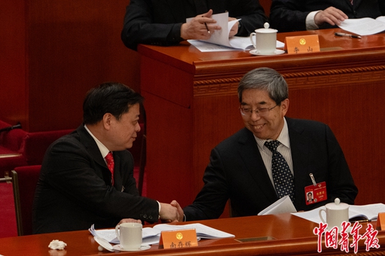 3月7日,北京人民大会堂,全国政协十四届二次会议第二次全体会议上,全国政协委员马建堂(右)结束大会发言后,浙江省工商联主席,正泰集团董事长南存辉主动与他握手致意。马建堂在大会发言上说,更好地满足失能老人的护理需求、减轻家人负担、提高老人生活质量已成为我国养老服务体系亟待解决的突出问题。中青报·中青网记者 李峥苨/摄