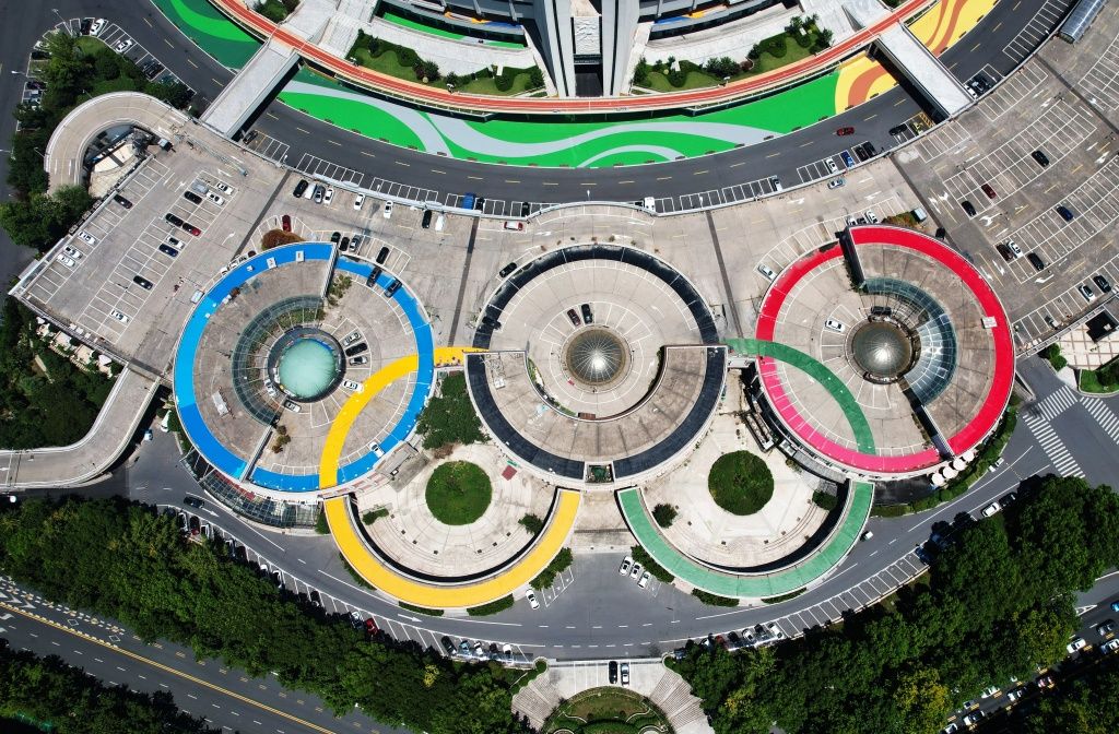 2022年8月7日,从空中俯瞰杭州黄龙体育中心的亚运五环广场。