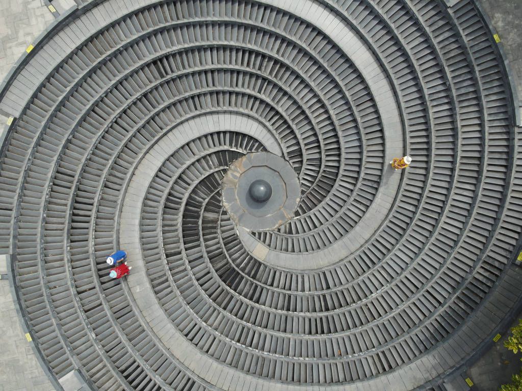 2022年9月12日,航拍南宁金湖广场的一处超现代的巨大环形神秘喷泉漩涡,螺旋状阶梯扭曲旋转、环环相扣,极具未来感。
