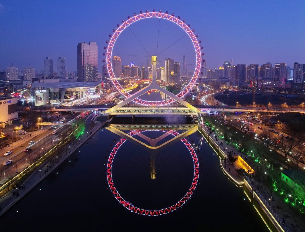 2024年2月11日,大年初二,天津之眼摩天轮景区灯光璀璨,热闹非凡,吸引了许多市民及游客前来打卡。 中新社记者 佟郁 摄