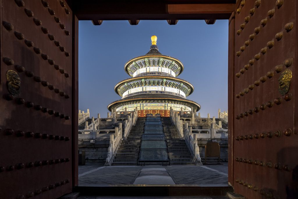 2022年10月19日,北京,天坛祈年殿的照明景观灯亮起,气势恢宏。