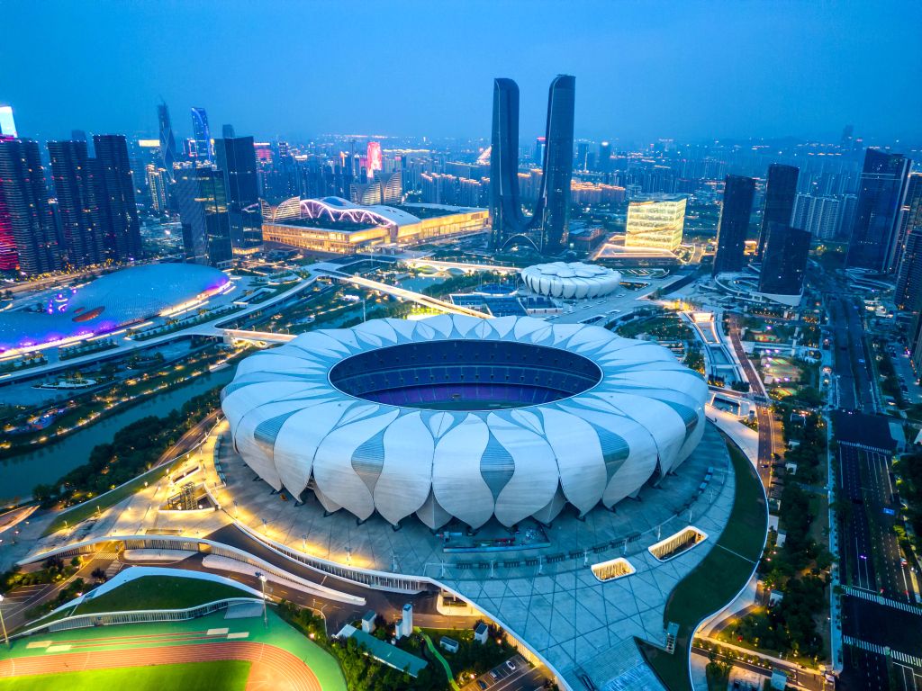 2022年7月22日,浙江杭州,2022杭州亚运会前瞻,航拍杭州奥体中心体育场。