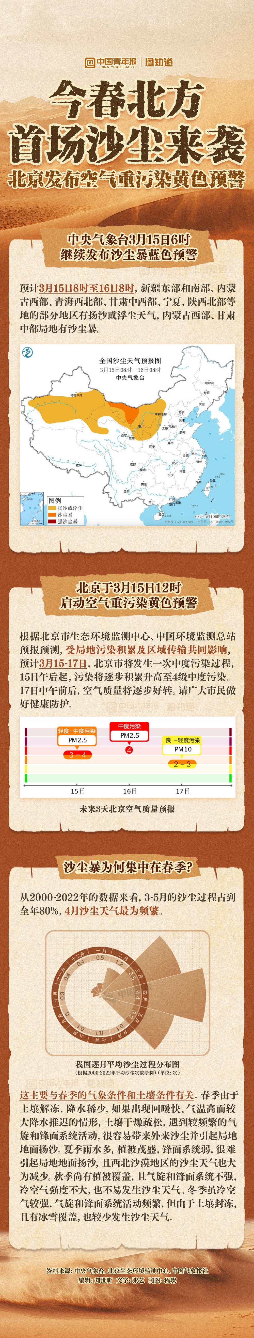 中央气象台今晨继续发布沙尘暴蓝色预警,涉及内蒙古西部、甘肃中部等地,这是今年春天北方首场沙尘天气。北京启动空气重污染黄色预警,预计3月16日夜间至17日上午,北京或受沙尘天气传输影响,PM10浓度明显上升。沙尘天为何集中在春天?一图了解。
