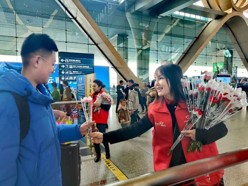 今年春节期间,来云南旅游的部分游客,一下飞机便收到穿红马甲的志愿者送上的玫瑰。