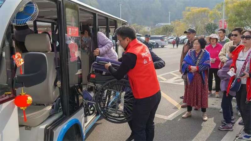 腾冲市专门组建了帮扶残障人士的文旅志愿服务团。志愿者唐廷禹一个人又抬轮椅又搀扶行动不便的老年游客。他说:“希望我们的付出能让他们享受到旅游的乐趣。”