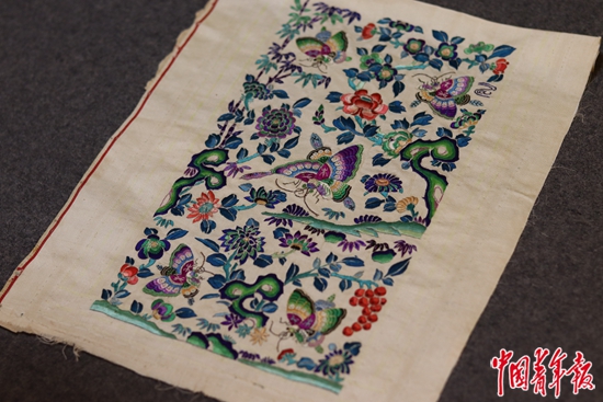 在毕红的工作室里有一个老樟木箱,里面满满当当都是20多年来她悉心珍藏的清代宫廷服装和绣品。每一件绣品的年份、材质、色彩搭配、纹样寓意,毕红都能如数家珍,并带着徒弟们精心保护记录。