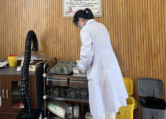 3月14日,大学生村医刘玉洁正在安徽省合肥市肥西县桃花镇染坊村卫生室的中医阁内整理消毒好的火罐。为贯彻落实《“十四五”中医药发展规划》,深入实施《基层中医药服务能力提升工程“十四五”行动计划》,提升基层中医药服务能力,2023年2月,国家中医药管理局组织制定了《社区卫生服务中心 乡镇卫生院中医馆服务能力提升建设标准(试行)》《社区卫生服务站 村卫生室中医阁建设标准(试行)》。按照上级要求,2023年7月,染坊村卫生室开设了中医阁,刘玉洁正是因为中医阁的开设来到染坊村上班。受访者供图