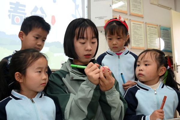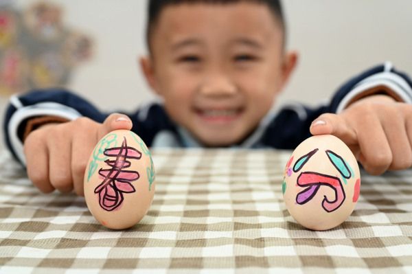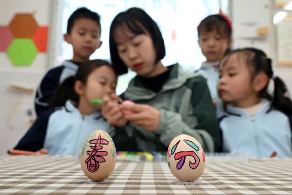 2024年3月18日,四川内江,幼儿园小朋友在老师指导下体验绘彩蛋和竖鸡蛋等传统习俗。