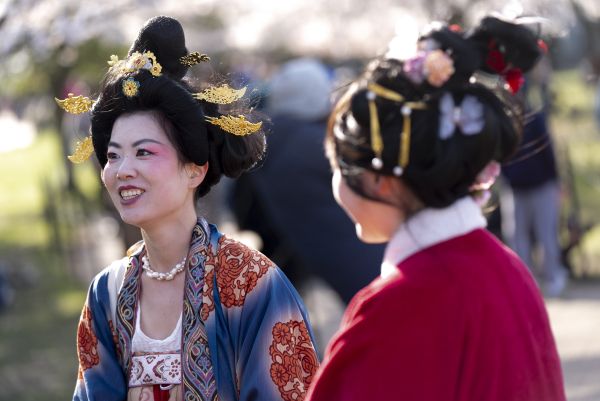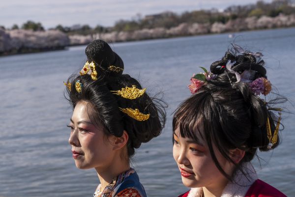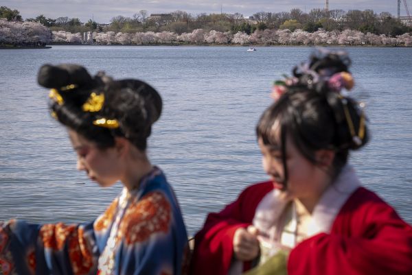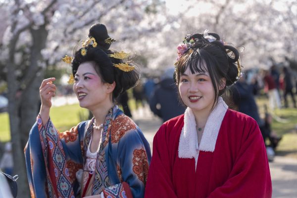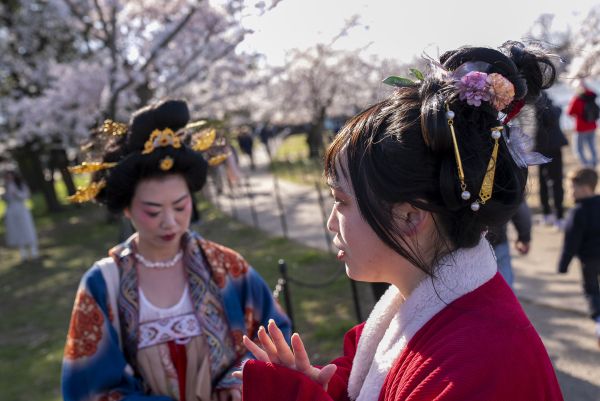 当地时间2024年3月19日,美国首都华盛顿特区樱花盛放,各类品种吸引了大量游客前来踏青赏花。其中,中国游客Ailin Deng和Xinyu Liang装扮成唐代仕女格外引人注目,演绎了一幅现实版簪花仕女图。