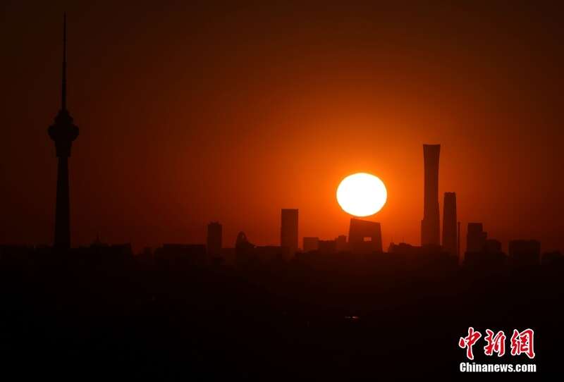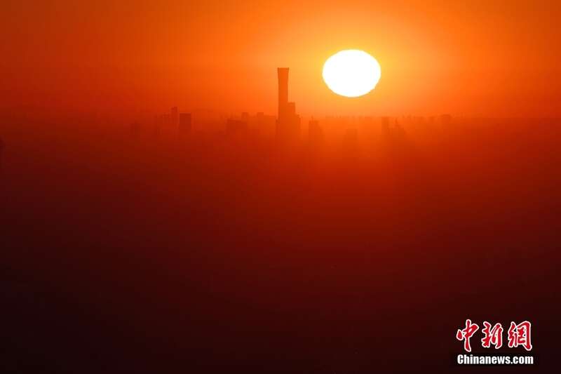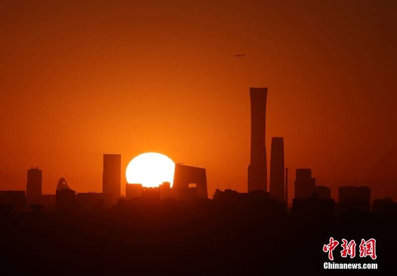 3月20日,春分节气,太阳从北京CBD建筑群上空升起。