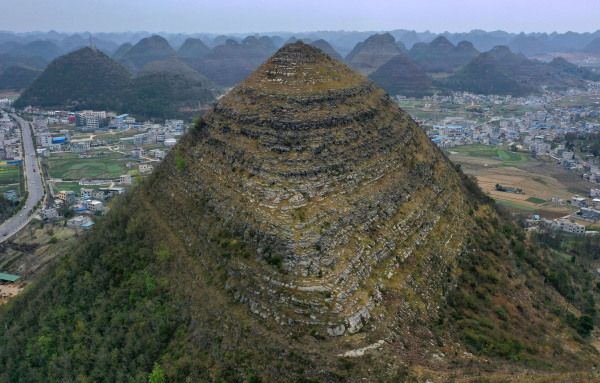 两座金字塔位于安龙县城郊外3公里的坡云村,是因两年前的一场大火让隐藏在茂密植被中的神秘“金字塔”山体得以展现,两座“金字塔”的山体高约150米和200米,整个山体为2亿多年前的三叠纪时期,海洋形成的泥质白云岩夹泥岩,海洋原始沉积的水平层理保存完好,无人机俯瞰其周边大地是典型的喀斯特峰林地貌,酷似“金字塔”的锥形山体其实还有许多,这种独特的锥体喀斯特山体的形成,是因为安龙县城一带的喀斯特地貌区的岩石具有可溶蚀性,在漫长的地质年代中,地壳运动的上升和流水垂向侵蚀的结果造成原有的大片地表岩石,被切割成独立的单元,由于岩石软硬强度的差异性,在地壳运动和水的共同作用下,山体顶部的岩层被大量侵蚀,而底部岩层侵蚀程度相对较轻,因此就形成了顶部尖锐底部宽大的尖顶椎状形态。“金字塔”是自然形成的喀斯特地貌景观,对于地质学、地貌学及环境变迁等领域具有极高的科研价值。