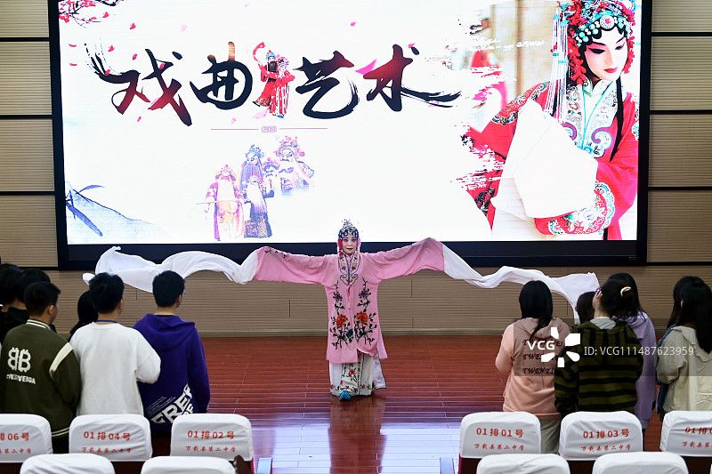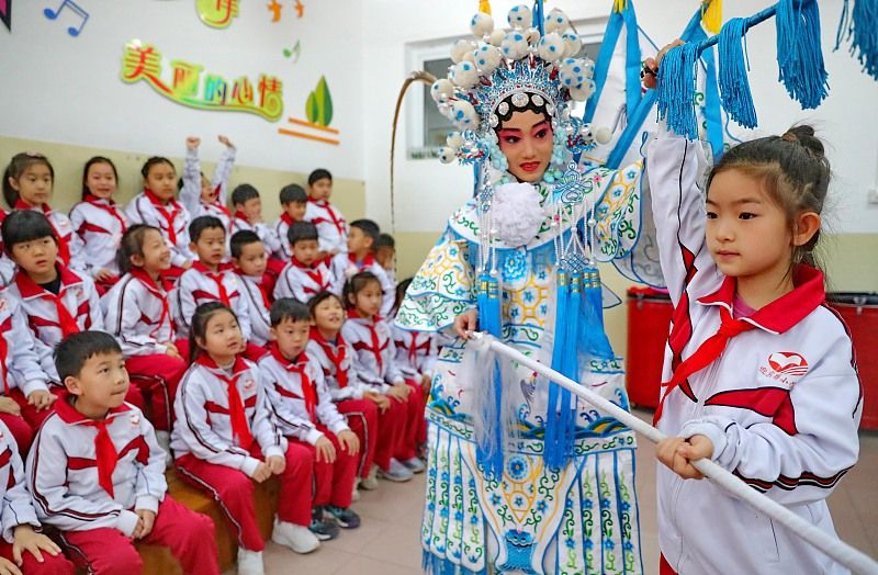 2024年3月26日,河北省秦皇岛市海港区迎宾路小学学生表演京剧《杨门女将·探谷》。当日,河北省秦皇岛市海港区迎宾路小学开展“戏剧文化进校园”活动。据了解,该校通过引导学生学习戏剧知识、表演戏剧片段等多种方式,让学生感受中国传统文化魅力,迎接“世界戏剧日”。