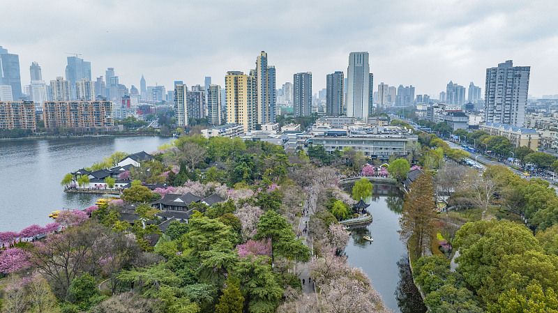 2024年3月26日,江苏南京市莫愁湖公园里海棠花、樱花等百花盛开,在空中看去美如画。