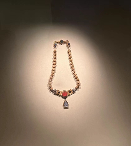 再看嵌珍珠宝石金项链,这是隋代9岁早夭的李静训墓中出土的最令人瞩目的首饰。项链两边由28个金珠组成,每个金珠均由12个小金环焊接而成,再各嵌10颗珍珠。项链上端内嵌一颗深蓝色垂珠,其上刻有一只花角鹿。下端镶嵌红宝石,最下端挂一心形金饰,上面镶嵌一块极为罕见的青金石。
