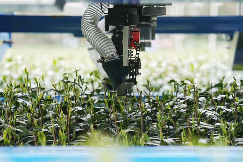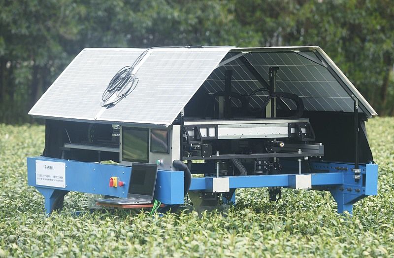 2024年3月26日,杭州,位于梅家坞的龙井茶园内,浙江理工大学研制的三台加载AI技术的智能采茶机器人开采明前西湖龙井。