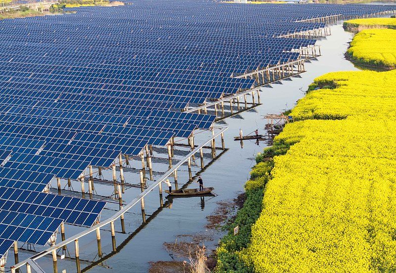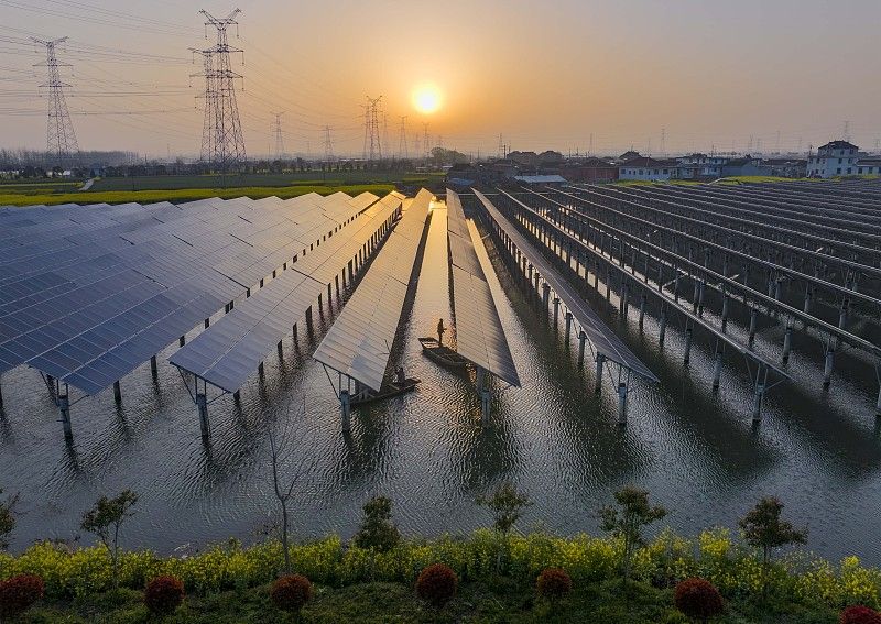 春日时节,从空中俯瞰位于里下河地区的江苏省泰州市姜堰区淤溪镇“渔光互补”光伏电站与民居、油菜花田相互映衬蔚为壮观,构成了一幅生机盎然的水乡春天图画,美不胜收。近年来,泰州市利用里下河地区河道水网密布优势,大力发展风电、光伏等清洁新能源,创新形成立体绿色低碳产业模式,助力乡村振兴,实现生态效益和经济效益双提升。