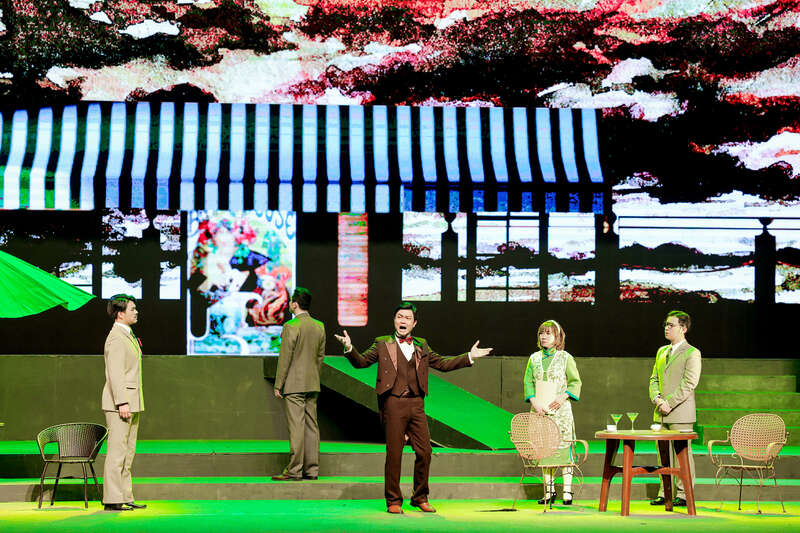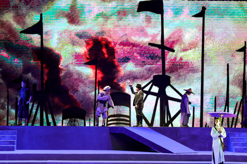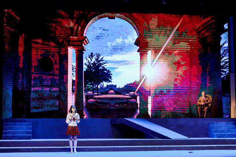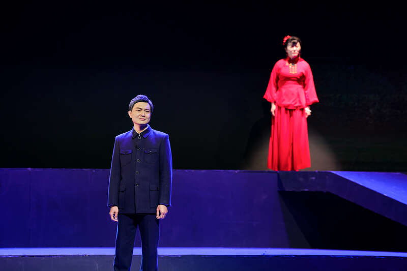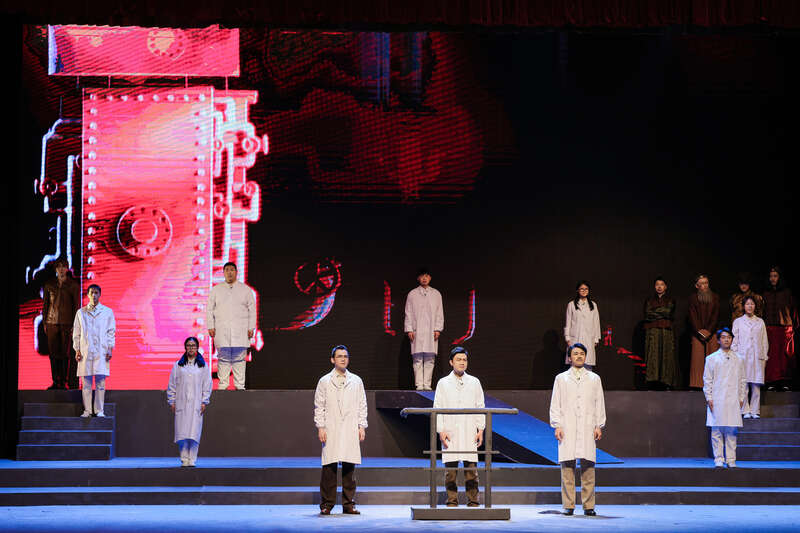 “终有一天,那些工厂会是我们中国人的!终有一天,江海上的轮船会是我们中国人造的!终有一天,那一条条铁路的主权是属于我们中国人的!”灯光缓缓亮起,一位打着油纸伞的年轻演员走上舞台,展示出老一辈科学家面对国家技术落后、受人欺凌的状况时,如何坚定“要用科学技术振兴民族”的伟大信念。