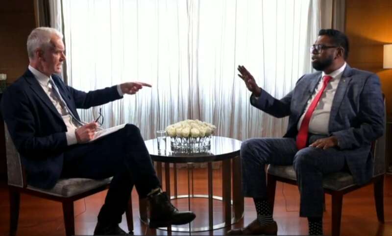 阿里很快打断了萨克尔的提问,他强调,圭亚那始终致力于环境保护:“让我在这里打断你。你知道吗?圭亚那有一片永久性的森林,它的面积有英格兰和苏格兰加起来那么大。这片森林储存了195亿吨碳,我们一直在保护这片森林。”