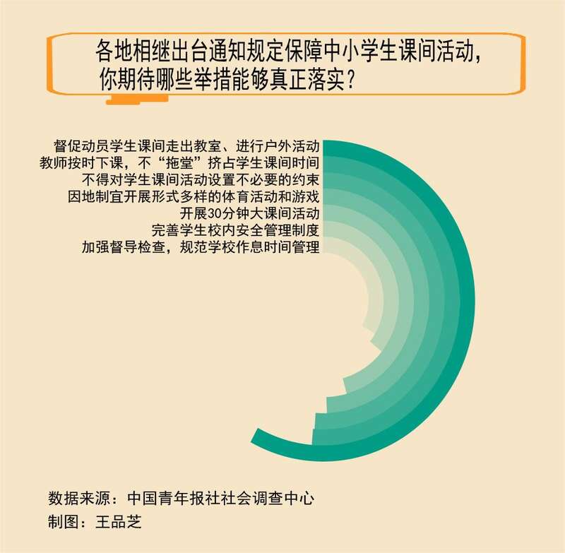 调查中,57.9%的受访家长期待各地督促动员学生课间走出教室、进行户外活动,51.3%的家长希望教师能按时下课,不“拖堂”挤占学生课间时间。