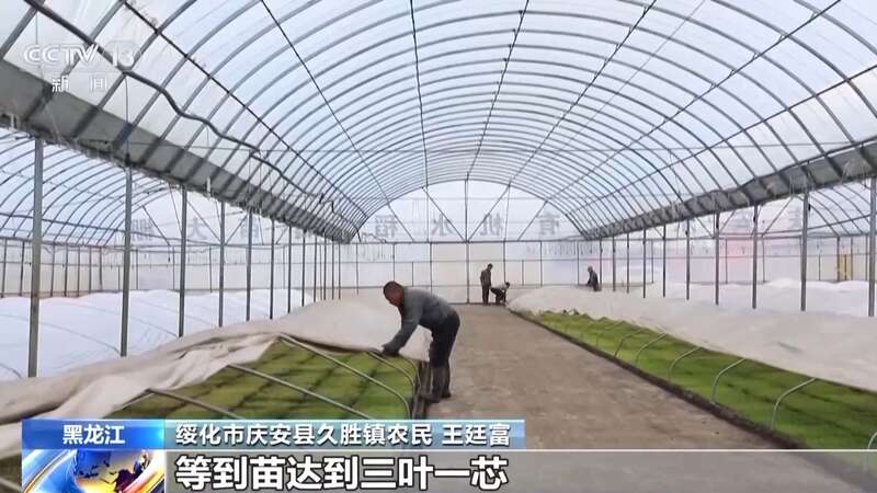 随着天气渐暖,黑龙江庆安水稻育秧全面启动。今年,当地重点推广应用超早钵育高产栽培技术,通过提前近十天育秧,延长水稻营养生长期,保证优良品种稻米成熟度,增加产量,提升品质。在庆安国家现代农业科技示范展示基地,联体大棚第一批秧苗已破土而出,苗床上一片翠绿。