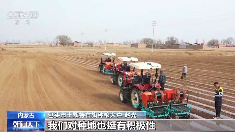 内蒙古今年粮食意向种植面积超过1.1亿亩,比上年稳中有增。其中玉米、水稻意向种植面积均增加。在土右旗种粮大户赵光的地块里,安装北斗导航的无人驾驶旋耕覆膜一体机,正开足马力来回穿梭种植覆膜玉米。得益于大力推进撂荒地整治、高标准农田建设等,今年当地新增土地面积约10%,让赵光又多流转了3000亩地。