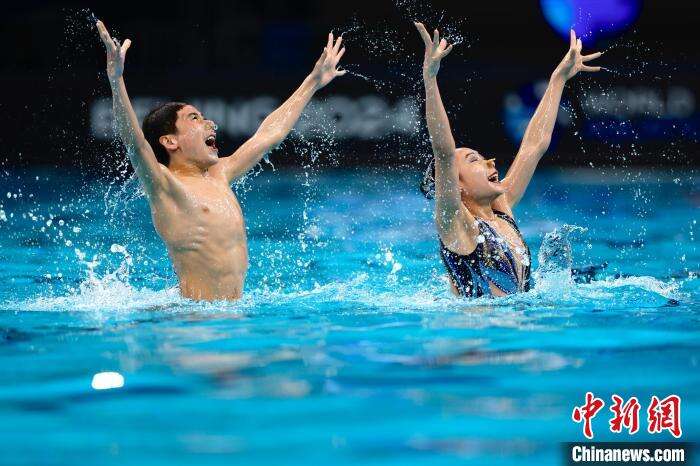 5日,2024年世界泳联花样游泳世界杯北京站混合双人技术自选比赛中,中国组合郭牧也(左)、季荷悦夺金。中新社记者 富田 摄