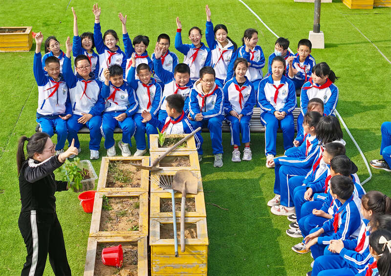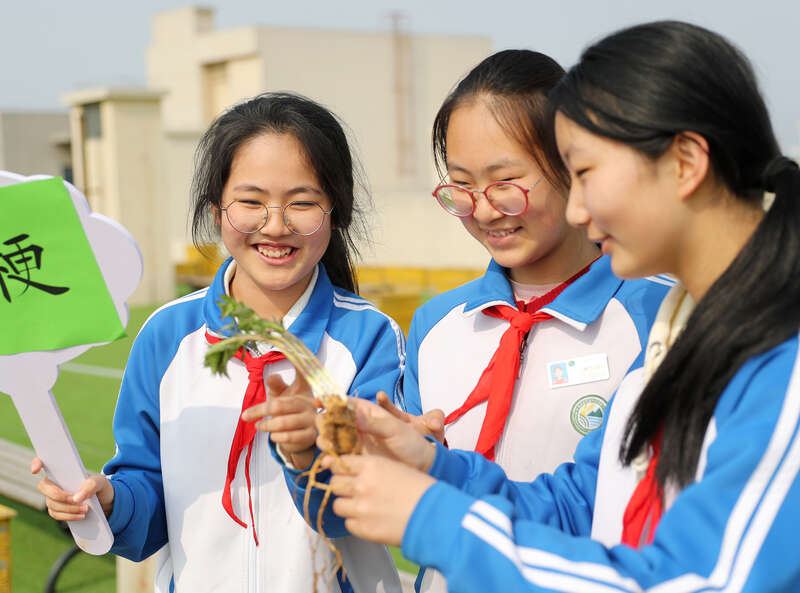 该校利用校园建筑楼顶平台,开辟了楼顶小农场,由每个班级管理一块“责任田”。在教师的带领和指导下,学生参与蔬菜、中药材的种植管护,在劳动实践中磨炼意志,培养勤俭节约、热爱劳动的良好习惯。