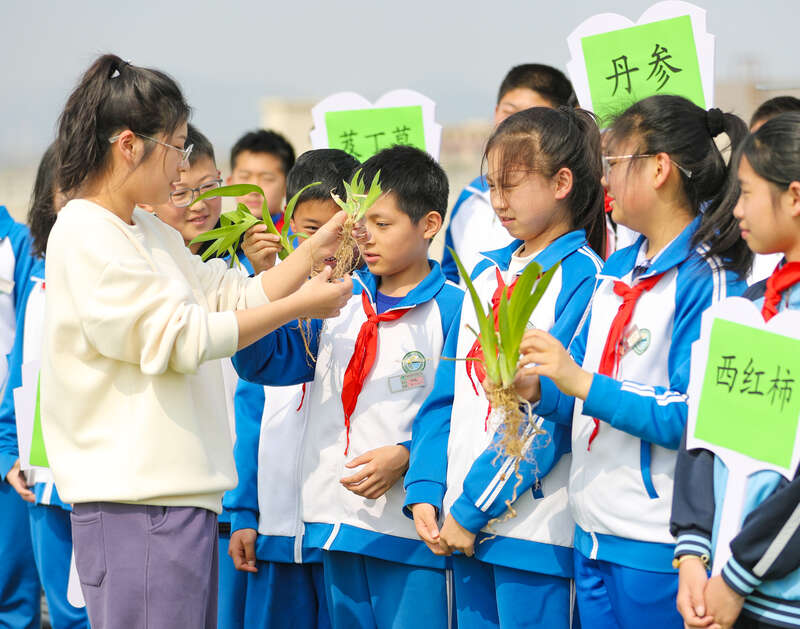 4月8日,青岛西海岸新区胶南小学的教师给学生讲解种植知识。张进刚/摄