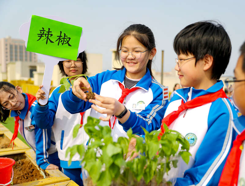 中国青年报客户端讯(中青在线记者张胶 通讯员 张进刚)4月8日,山东青岛西海岸新区胶南小学学生在校园的楼顶农场开展春季劳动实践。