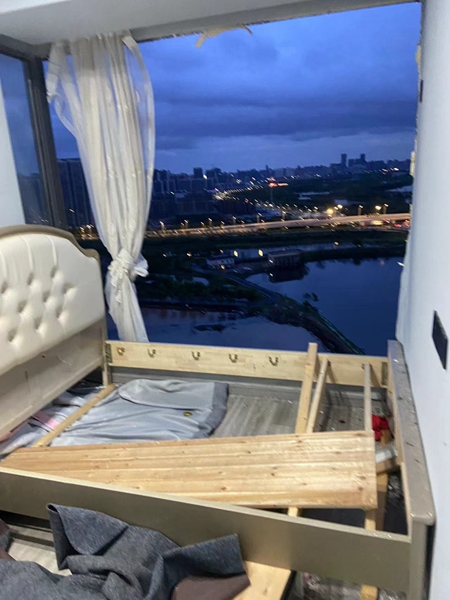 2时58分左右,张黎被风雨惊醒时,睡在次卧的儿子和婆婆已经不见了。整扇窗户连着窗框、天花板、床垫、床头柜,一起消失了。卧室破了一个大洞,风“呼呼”往里灌。