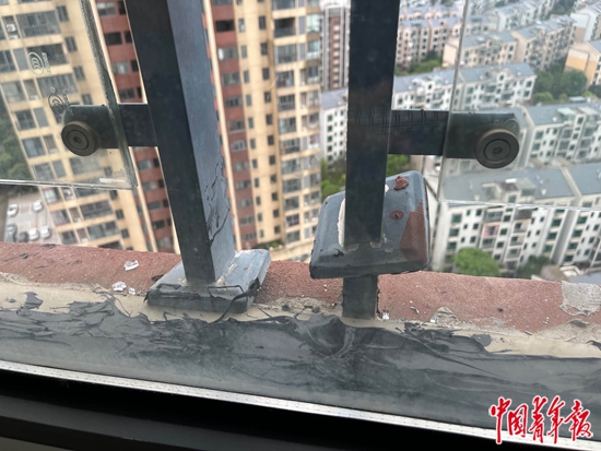 临峰香阁3栋18层的一位住户发现阳台的落地窗发生了0.5厘米的位移,她请人来加固时发现,新旧螺丝的大小之差,就像中指和小拇指。