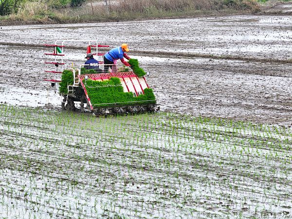 4月10日,安徽芜湖,湾沚区六郎镇周圩村汇丰农业高标准农田里,农民正驾驶插秧机栽插再生稻秧苗。