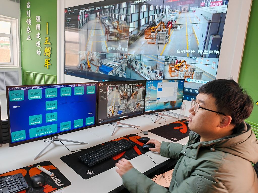 4月3日,黑龙江双鸭山,在黑龙江北大荒农业股份有限公司友谊分公司水稻智能育秧中心,技术人员在控制中心操作育秧设备。