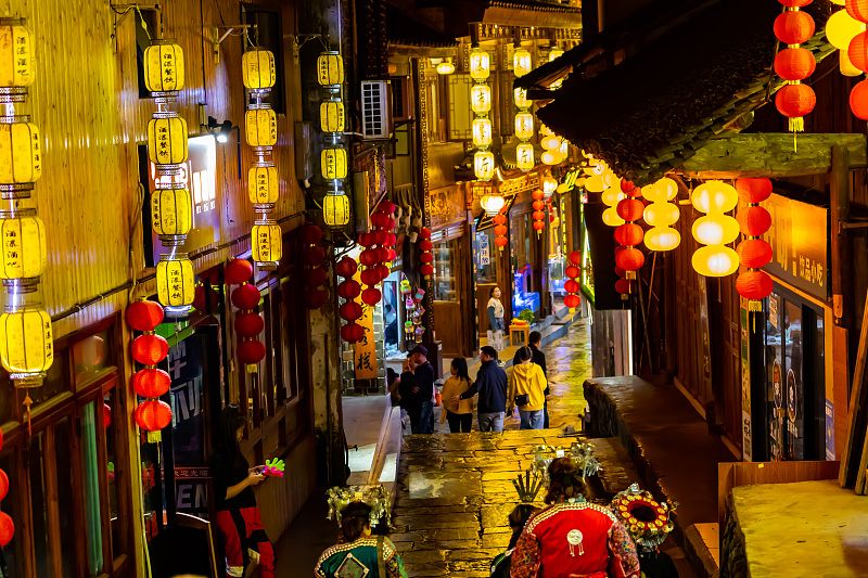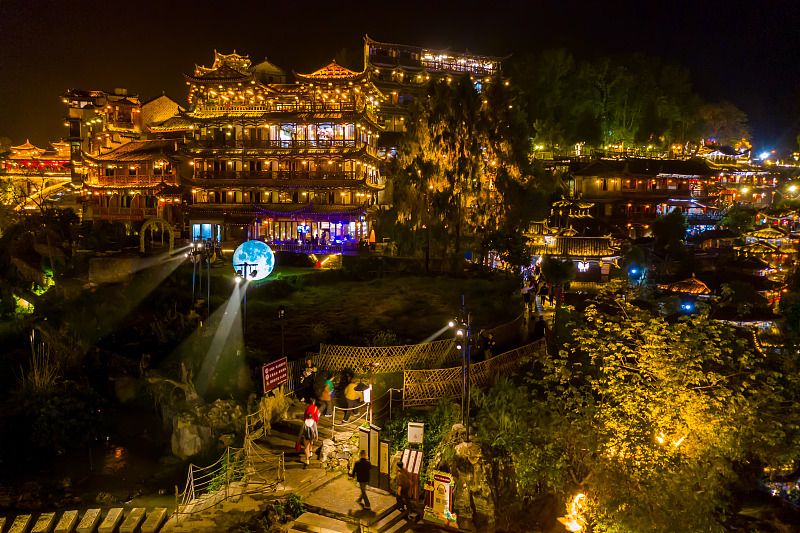 当晚湖南省湘西土家族苗族自治州永顺县芙蓉镇夜景古城夜色和灯光交相辉映,美如画卷,吸引了众多市民和游客来此游玩。
